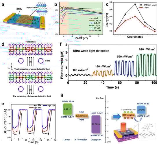 A two-dimensional (2D) halide perovskite forming quantum-well structure is drawing attention for its low-cost efficiency, unique optical property, and moisture stability [4]. However, the ion migration characteristic in halide perovskite induces a long carrier lifetime. Li et al. showed a negative photogating effect of the heterostructure FET by utilizing the structure of CNT and its feasibility as photo-memory (Figure 3a) [106]. The ID of the device was reduced with the increase of 470 nm light intensity (dark to 500 μW) illumination, showing the negative photogating effect (Figure 3b). As the photo-excited electrons migrated into the conduction band, halogen vacancies in the perovskite also migrated through the pathway. It led to a decrease in the diffusion barrier and an increase in the dielectric constant (Figure 3c). The cylindrical structure of CNTs caused potential redistributions, and consequently resulted in VG screening on CNTs by (PEA)2PbI4 (Figure 3d). The migrated ions under light irradiation were captured in a quasi-steady state when back in a dark condition, suggesting a possibility as an optical memory device (Figure 3e). Despite carbon nanotubes (CNTs) being highly light absorbent materials with excellent carrier mobility, binding energy resulting from the unique 1D structure makes them suffer from low operating speed [107,108]. In 2021, Yang et al. implemented IR phototransistors with a PQT-12 (poly (3,3‴-dialkylquaterthiophene)/F4-TCNQ (2,3,5,6-tetrafluoro-7,7,8,8-tetracyanoquinodimethane) donor/acceptor (D/A) as a photoactive layer and single-walled carbon nanotubes (SWCNTs) as a channel layer [109]. The IR phototransistor has shown its feasibility in various fields, such as blackbody detectors, flexible phototransistors, and synaptic devices [110]. The electronic transition energy (0.4 eV) of the D/A complex is due to charge transfer excitation attributed to the broadband photodetection extending from the visible region to the NIR region (400–2600 nm). An R of 2.75 × 106 A·W−1 and detectivity (D*) of 3.12 × 1014 Jones under 2000 nm were obtained with good stability and repeatability. The device responded even when ultra-weak 100 nW·cm−2 light was illuminated (Figure 3f). Under light irradiation, photogenerated holes were injected from the D/A complex to the SWCNTs layer, while photogenerated electrons were trapped at the trap sites present in the D/A complex, defects, or complex/SWCNTs interfaces (Figure 3g).