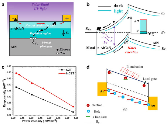 The wide bandgap (>3.4 eV of gallium nitride, GaN) of semiconductor materials, including gallium(III) oxide (Ga2O3), MgxZn1−xO, and III-nitride compounds (AlxGa1−xN/AlN and BN), are emerging as the next generation materials for solar-blind ultraviolet (SBUV) photodetectors [111,112]. In 2022, Lu et al. proposed a solar-blind ultraviolet (UV) detector with high photodetection performance and a simple structure and process (Figure 4a) [113]. Spontaneous and piezoelectric polarization of n-Al0.5Ga0.5N generated a perpendicular electric field (EP), which contributes to an increase in IPh because of the photogating effect. Under light irradiation, EP dissociated the photoinduced excitons in the depletion channel region into electrons and holes, respectively. The negatively charged interface accumulated holes, leading to less band bending and more electron injection, thus enhancing the photoconductivity (Figure 4b). The ultrafast rise time of 537.5 ps and R of 105 A·W−1 at 20 V bias were obtained, which took a fast response speed and high R-value. The IOn/IOff ratio of 104 at a very weak intensity of 0.7 nW·cm2 further showed its potential for use as a flame detector. Cadmium zinc telluride (CdZnTe or CZT) is an emerging material as a radiation detector owing to its wide band gap of ~1.68 eV, large photon absorption area, high resistivity of 1010 Ω·cm, and environmental stability [114,115]. However, its applications are limited due to impurities and inherent defects, which lead to the low hole mobility. Shkir et al. accomplished a balanced carrier concentration by inserting indium into the CZT crystal as an additional donor impurity [116]. The photogating effect caused by these additional defects led to a low IOn/IOff ratio and D*, while there was an increase in R and EQE compared to those of intrinsic CZT (Figure 4c). Under light irradiation, the photogenerated electrons trapped at the trap states acted as an additional gate voltage bias, reducing the resistivity of devices (Figure 4d). On the other hand, the photogenerated holes can transit many cycles before the recombination, leading to a high EQE. They showed a new area of research based on CZT crystals for future visible photodetector devices utilizing the photogating effect, along with improving the IOn/IOff ratio or D*.