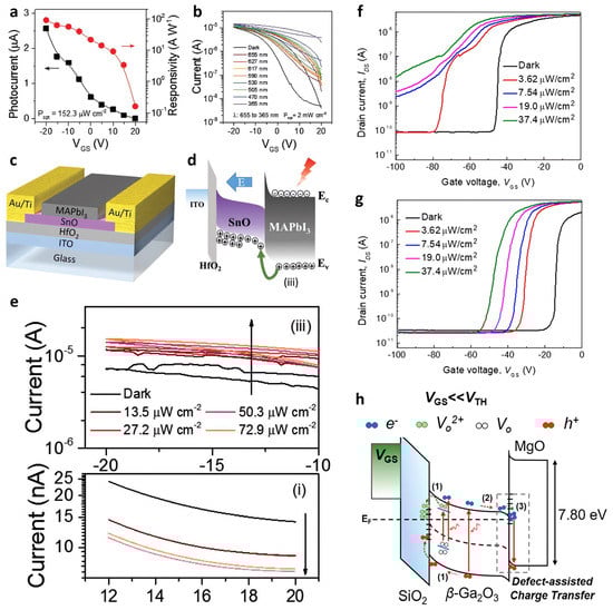 In 2019, Guan et al. introduced tin monoxide (SnO) as a new p-type oxide-based phototransistor [127]. Although the SnO-based device itself exhibited a good photodetection performance with R = 1.83 × 103 A·W−1 (Figure 6a) and a broadband response from the UV to visible range (365–655 nm) (Figure 6b), its moderate light absorption characteristic drew attention to other methods. Therefore, a photodetector with better performance was realized by coating hybrid perovskite MAPbI3 as a photoactive layer for a smooth charge transfer from perovskite to p-type SnO (Figure 6c). MAPbI3 only covered the channel layer and did not contact the electrodes. When exposed to white light, the on-state current increased, and the off-state current decreased compared to the dark state. When VG > 0 V (panel (i) in Figure 6e), the IOff was decreased because of charge recombination as the electrons generated in MAPbI3 were transported to the SnO, and because of the photogating effect, as photogenerated holes remained in the perovskite layer. Because the opposite carrier movement was observed when VG < 0 (panel (iii) in Figure 6e), the photogenerated holes migrated to the SnO, and the photogenerated electrons remained in the MAPbI3. The additional negative gate bias was ascribed to the photogating effect and the increased hole injection, leading to an increase of the IOn (Figure 6d). Therefore, the IOn/IOff ratio increased from 519 to 2674, and μ increased from 3.46 to 5.53 cm2·V−1·s−1. Wide-band-gap semiconductor-based optoelectronics respond in the deep-ultraviolet (DUV) range, bringing their solar-blind properties to industrial, biological, environmental, and military applications [128,129]. In 2021, Ahn et al. chose β-Ga2O3 as the photo-absorption and channel layer, which provides a detection wavelength at 230–280 nm [130]. By adding Al2O3 encapsulated MgO layer on top of the device, the device showed no hump in transfer curves unlike the device without MgO layer (Figure 6f,g). A high R and D* of 2.3 × 107 A·W−1 and 1.7 × 1015 Jones, respectively, were obtained with the β-Ga2O3/MgO heterostructure-based phototransistor. This was possible because of the defect-assisted charge transfer mechanism. When VG was smaller than VTh, photo-excited hole carriers and oxygen ion vacancies were accumulated at the deep oxygen defect trap sites in the SiO2/β-Ga2O3 interface, shifting the VTh to a negative gate bias (process 1 in Figure 6h). At the same time, the photogenerated electrons were accumulated at the β-Ga2O3/MgO junction, suppressing the photoconductive effect and only allowing the photogating effect to appear (process 2 in Figure 6h).