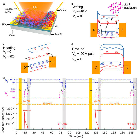 Conventional memory is no longer sufficient to meet the modern needs of ultrahigh-density data storage, such as multilevel storage, data encryption, image capturing, information recording, logic data processing, and wearable sensors [140,141,142]. Therefore, new memory devices that transmit information quickly with low energy consumption are in demand. In 2022, Kim et al. reported an ambipolar photo-memory-transistor using a π-conjugated p-type Poly[(2,6-(4,8-bis(5-(2-ethylhexyl)thiophen-2-yl)-benzo [1,2-b:4,5-b′]dithiophene))-alt-(5,5-(1′,3′-di-2-thienyl-5′,7′-bis(2-ethylhexyl)benzo [1′,2′-c:4′,5′-c′]dithiophene-4,8-dione)] (PBDB-T) and n-type N2200 macromolecular copolymer (P(BDBT-co-N2200)) (Figure 8a) [143]. The transistor exhibited high hysteresis because of the interfacial trap states. These intrinsically localized quantum states are according to the amorphous phase of the D/A heterojunction. On the other hand, hysteresis was reduced and IPh was increased when irradiated with light because of the photogating effect by the charges trapped at the trap states. The trapped charge carriers determined the writing (W) (Figure 8b), reading (R) (Figure 8c), and erasing (E) (Figure 8d) states of the optoelectronic memory device by adjusting the VG and light irradiation conditions, respectively (Figure 8e). The device showed reliable storage performance with a constant readout current owing to the relatively strongly trapped carriers.