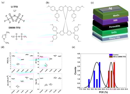 Molecular structures of Li-TFSI and EMIM-TFSI in (a) and X60 in (b). (c) Schematic structure of the planar perovskite solar cell manufactured in this work (not in scale). (d) Evolution of photovoltaic parameters with increasing EMIM-TFSΙ concentration. (e) Statistic distribution of PCE of control and 12% EMIM-TFSI-doped devices.