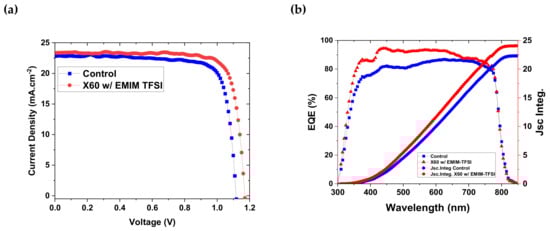 (a) J–V curves of the best performing control and EMIM-TFSI-doped (12 wt%) devices. (b) EQE spectra for the best performing devices. The integrated current density depicted on the right axis was calculated from the device’s spectral response and the AM1.5G photon flux spectrum. Integrated current density was estimated at 22.85 and 23.97 and mA cm−2 for the control and EMIM-TFSI (12 wt%), respectively.