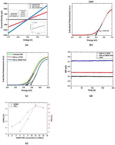 (a) Two-probe conductivity characterization. Cube root photoemission response of (b) FAPI and (c) undoped X60, LiTFSi, and EMIM-TFSI-doped X60. (d) WF measurements of PVSK and HTLs in the dark, and (e) the HOMO energy level position of X60 and the PCE as a function of EMIM-TFSI concentration.