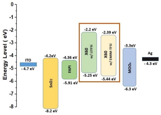 Energy level alignment in the device stack. In the figure are shown the energy levels of X60 doped with Li-TFSI and with EMIM-TFSI. Doping with EMIM-TFSI lowers the energy levels of X60.