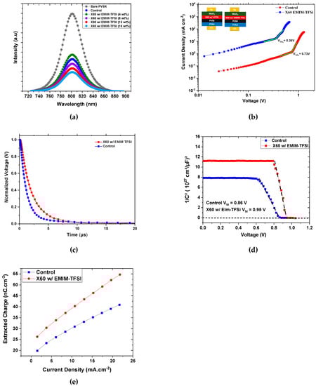 where V represents the applied DC bias, N denotes the impurity doping density, A denotes the active area of the device, and εο and εr represent vacuum and relative permittivity, respectively. The Vbi can be determined using the X-intercept of the linear regime of the M–S plot. The device with EMIM-TFSI-doped X60 exhibited a higher Vbi of 0.96 V than the control device’s 0.88 V, which is consistent with the higher Voc of the EMIM-TFSI-doped devices. The enhanced Vbi can be attributed to the reduction of nonradiative recombination due to the efficient passivation of charge defects at the perovskite surface and to the deeper HOMO of EMIM-TFSI-doped X60 [52]. The transient photocurrent measurements (TPC) involve the photo-excitation of the complete device with a short light pulse, slightly perturbing the otherwise constant bias illumination and creating charges out of the equilibrium. Then, after turning off the light, the perturbation charges will recombine, and after some time the current will reach equilibrium. The speed of the process is determined by charge carrier mobility, trap states, and doping levels [47]. The extracted charge from the TPC measurements on the full devices was plotted as a function of current density, as seen in Figure 5e. The EMIM-TFSI facilitates charge collection in comparison with Li-TFSI, which is in a good agreement with the non-radiative recombination lifetime extracted from the TPV measurements [61,62,63]. The analysis of the steady-state and transient measurements indicate the high capability of EMIM-TFSI to p-type-doped X60 and to improve the charge collection in the device.