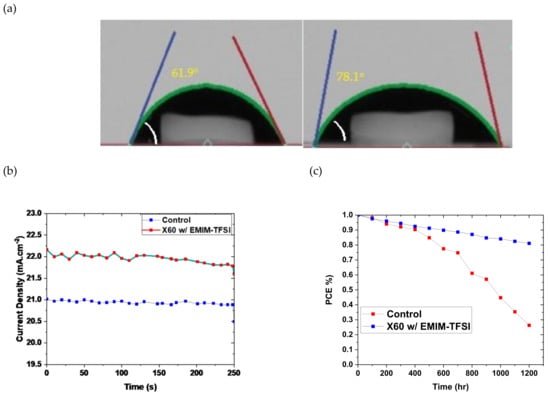 The stability of PSCs is an important performance metric for the commercial potential of PSCs. The stabilized photocurrent density at maximum power point (MPP) as a function of time is depicted in Figure 6b. Devices based on HTL doped with 12% EMI-TFSI and Li-TFSI exhibit a steady current density of 22.02 mAcm−2 and 21.01 mAcm−2, respectively, keeping in tune with the PCE values tested by J–V measurements. PSCs degrade when exposed to humidity, thermal stress, and UV light, limiting their lifetime. Numerous researchers have participated actively in efforts to improve the stability of perovskite solar cells. [56,57,58,59,60,61,62,63]. The long-term operational stability of the devices was investigated under ambient conditions, according to the ISOS D-1 protocol [60]. Unencapsulated devices were stored in the dark under ambient conditions and approximately 50–60% RH and evaluated at regular intervals. As depicted in Figure 6c, the PCE degradation curve for the X60 demonstrates that the EMIM-TFSI-based device retains approximately 88% of its initial efficiency after more than 1100 h of storage. After 950 h of operation under the same aging conditions, the PCE of devices with X60:Li-TFSI declines to 45% of its initial value. To further evaluate the stability of EMIM-TFSI-doped devices, we measured the water contact angle. Figure 6a demonstrates that the X60:EMIM-TFSI-based film has a larger contact angle (78.1°) than the Li-TFSI-doped films (61.9°). Li-TFSI is known for its high hydrophilicity and has a detrimental effect on the stability [64,65,66,67,68]. Thus, the higher hydrophobicity of X60:EMIM-TFSI shields the HTL from water penetration and hence protects the underlying perovskite from the ambient humidity. In Table 3 are listed recent articles regarding PSCs that incorporate Spiro-OMeTAD as the HTL, doped with Li-free dopants, along with devices that used X60- and SFX-based HTLs. Compared to the Spiro-OMeTAD devices, our devices exhibit similar PCEs, but better stability. Moreover, our approach delivers devices with the highest PCE among the X60-based PSCs.