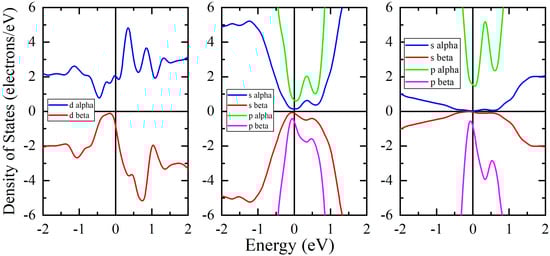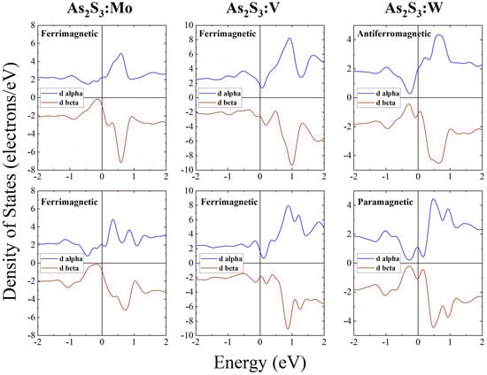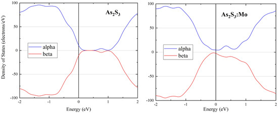 In order to verify the appearance of magnetism, we performed spin-up and spin-down PDOS (alpha and beta) calculations. As can be seen from Figure 4, spin-up and spin-down contributions from Mo d-electrons are clearly different. At the same time, PDOS of spin-up and spin-down states associated with As and S atoms also become slightly asymmetric which indicates the presence of some contribution to the magnetic properties of the a-As2S3:TM from As and S atoms when doping with a TM impurity. It is interesting to note that a similar result, namely, an appearance of magnetism on normally diamagnetic S atoms was also observed for edge states of WS2 nanosheets [50].
