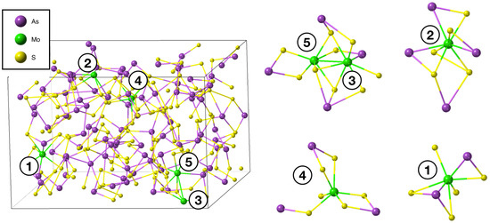 Melt-quenched a-As2S3:Mo obtained from AIMD simulations (left) and fragments of the structure centered around the Mo atoms (right). Mo atoms in the a-As2S3 structure are numbered from 1 to 5 (left panel). In the right panel, local structures around these atoms are shown. As atoms—violet; S atoms—yellow; Mo atoms—green.