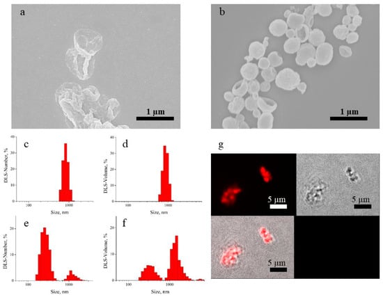 In order to develop a targeted anticancer drug delivery system, a series of biodegradable polyelectrolyte multilayer capsules were obtained. An electrostatic interaction is a dominant driving force for oppositely charged DS and Parg to assemble a multilayer structure on the surface of vaterite submicron particles. In the current study, (Parg/DS)3 capsules comprising of three bilayers were obtained. Biodegradable PMCs were compacted according to the protocol of thermo-induced shrinking. After that, both intact and shrunken PMC were characterized in terms of their physico-chemical properties. Figure 1a,b reveals visible changes in the size and morphology of PMC after heat treatment, which follows from a rearrangement in the interpenetrating multilayers. The DLS-number distributions (Figure 1c,e) demonstrate an intense peak shift to the left as the result of heat treatment of the PMC suspension. As derived from the DLS-number data, the average hydrodynamic size of the heat-treated capsules was 320 ± 80 nm. The comparison of the DLS-volume data before and after heating (Figure 1d,f) shows that a significant amount of micron-sized objects remain in the sample after heating; aggregates probably remain as well. This can also be seen in the DLS-number distribution (Figure 1e) but in this case, the micron-sized peak is not very intense. It is worth mentioning that the number and volume distributions show a relative proportion of a number of differently sized objects as well as the volume occupied by them. As a result, a small amount of the aggregates or larger capsules can dominate in the DLS-volume distribution.