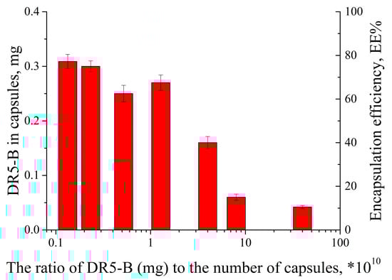 The DR5-B protein loading (mg) into the capsules and encapsulation efficiency (EE%) in the function of the DR5-B/a number of capsules ratio.