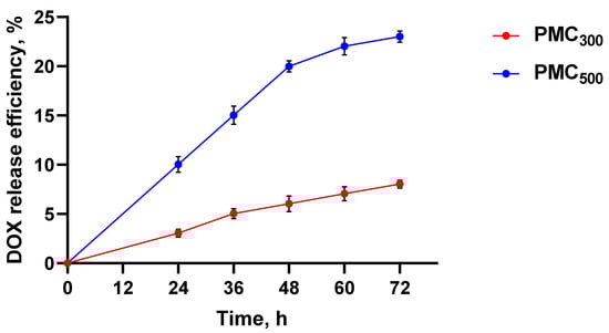 Thus, it was of interest to compare two PMC types, namely untreated (here and further PMC500 according to the mean diameter) and heat-treated ones (here and further PMC300). The DOX release efficiency from PMC500 and PMC300 is shown in Figure 3. It is clearly seen that the DOX release from the untreated PMC500 was significantly higher than that of thermally compressed PMC300. Therefore, after 72 h, about 20% of the drug was released from the PMC500, while only 6% was released from the PMC300. For this reason, the PMC heat treatment could be used to reduce the drug release efficiency and, consequently, to ensure its sustained release.
