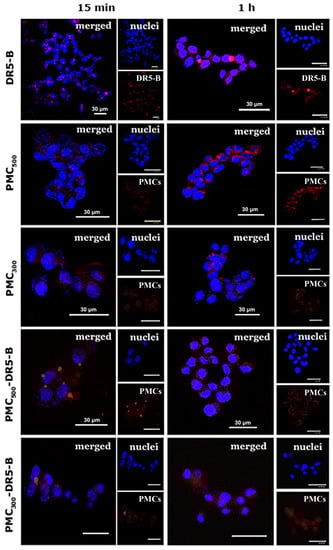 Thus, in the current study, a penetration and accumulation of PMC within the 3D multicellular tumor spheroids generated from HCT116 cells was also studied. As seen in Figure 5, after 15 min incubation unmodified PMC500 were observed within the spheroids, and in 1 h their fluorescence did not enhance. After 15 min incubation, the fluorescence intensity level of the unmodified PMC300 was a little bit lower than that of PMC500. However, after 1 h incubation the fluorescence values of both PMC500 and PMC300 were similar. As for DR5-B-modified PMC, there was no significant difference after 15 min and 1 h incubation.