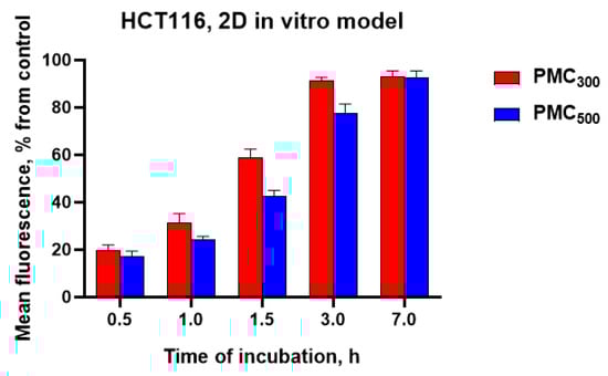 First of all, it was of interest to evaluate a difference in accumulation efficacy levels of DOX-loaded PMC300 and PMC500 for monolayer cell culture (Figure 6). The obtained results revealed that PMC300 accumulation efficiency in HCT116 cells was higher than that for PMC500 at all time points (0.5, 1.0, 1.5, 3 and 7 h). For both capsule samples, the accumulation levels were growing with time. The PMC300 accumulation levels were 19, 31, 58, 89 and 90% after 0.5, 1, 1.5, 3 and 7 h incubation, respectively, while for PMC500 the appropriate values were 17, 22, 40, 76 and 89%. Thus, one could conclude that the smaller capsules PMC300 accumulated in the cells faster than the bigger ones (PMC500). Maximum accumulation of PMC300 was observed after 3 h incubation and it did not change in 7 h. As for PMC500, their accumulation value continued to gradually increase after 3 h and reached its maximum only after 7 h.