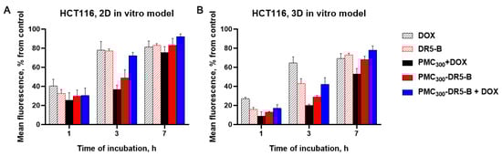 As seen in Figure 7, the maximum fluorescence levels in both 2D and 3D models were revealed for the capsules, which were loaded with DOX and modified with DR5-B. On the other hand, as was expected, the capsules accumulated in the spheroids more slowly than in the 2D in vitro model. This could be explained by the capsule penetration through several cell layers of the tumor spheroids. It should be noted that there was no significant difference in the accumulation of free DOX in 2D and 3D models, which could be related to rather low DOX molecular weight. A similar accumulation tendency for all samples was observed in both 2D and 3D in vitro models. Thus, in the case of the 2D model, for free DOX and free DR5-B samples the highest accumulation levels of 40 and 34%, respectively, were revealed after 1h. These values enhanced up to 78 and 77%, relatively, after 3 h. As for the spheroids, accumulations of both DOX and free DR5-B was slower in them than in the 2D model, namely 26 and 18% (in 1 h) and 63 and 43% (in 3h), respectively. The maximum accumulation levels of free DOX and the free DR5-B protein were revealed after 3 h incubation, in monolayer cell culture, while in tumor spheroids it took 7 h. This is in a good agreement with our previous results [,]. As for the capsule samples, the capsules loaded with DOX (PMC300+DOX) demonstrated the lowest accumulation efficiencies in all-time points both in 2D and 3D in vitro models. These values were 24, 38 and 77% (2D in vitro model) and 9, 19 and 53% (3D in vitro model) after 1, 3 and 7 h incubation, respectively. As for the capsule samples loaded with DOX and modified with the DR5-B protein (PMC300-DR5-B+DOX), their accumulation levels reached maximum values after 7 h in both 2D and 3D models. Therefore, as we expected, the modification of the DOX-loaded capsules with the DR5-B ligand provided their enhanced cellular uptake by HCT-116 cells.