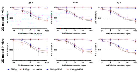 Cytotoxicity effects of the obtained DR5-B-modified PMC were evaluated by MTT-test (Figure 8, Table 1). In monolayer cell culture, the free DR5-B protein was the most cytotoxic in all time points, and IC50 values were 31 ± 2.6, 27 ± 3.2 and 10 ± 0.7 ng/mL after 24, 48 and 72 h, respectively. In contrast, PMC300 and PMC500 (without DR5-B) were completely non-toxic for the cells even after 72 h incubation with the highest sample concentration (IC50 > 1000 ng/mL). The DR5-B-modified capsules (PMC300-DR5-B) were more toxic than PMC500-DR5-B, which could be explained by their higher accumulation efficiency (see Figure 6). Thus, IC50 values were 72 ± 8.3 and 519 ± 38.5 ng/mL after 24 h, while after 72 h incubation appropriate values were 10 ± 3.4 and 24 ± 3.1 ng/mL for PMC300-DR5-B and PMC500-DR5-B, respectively.