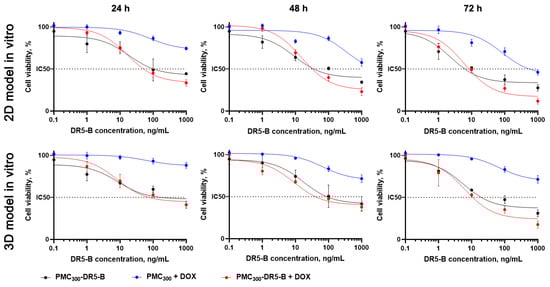 As seen in Table 2, the IC50 values of PMC300-DR5-B+DOX were markedly lower than those of the PMC300-DR5-B sample. A similar effect was observed for both controls, namely free DR5-B and the combination of free DR5-B with free DOX. Thus, the capsules, which were loaded with DOX and modified with DR5-B (PMC300-DR5-B+DOX), demonstrated synergistically enhanced cytotoxicity in both 2D and 3D in vitro models.
