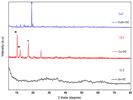 XRD patterns of (a) Cu-OC, (b) Sn-OC, and (c) CuSn-OC.