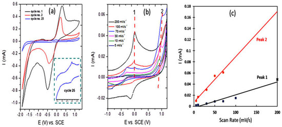 For the Cu-OC, as shown in Figure 6a, a large diminishing of the peek current appeared, and oxides of copper were produced with limited solubility as the potential was increased in the case of alkali metal hydroxide solutions [30]. Additionally, soluble species such as Cu(OH)4−2 were also speculated to form [31], which explained the large decay in the peak current. In Figure 6b, peak 1 may have been attributed to the formation of Cu2O whereas peak 2 may have been attributed to the soluble product of Cu(OH)4−2. The two peaks in the reduction region may have been due to the formation of Cu from CuO, at a potential of −0.12(V) and Cu(OH)4−2, or at a more negative optional up to −1 (V). As seen in Figure 6c, the anodic peak current increased linearly with an increasing scan rate, which indicates that the redox process was non-diffusional.