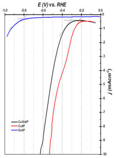 The HER performances of the Cu-OC, Sn-OC, and CuSn-OC catalysts were evaluated in a 0.1 M KOH electrolyte via a conventional three-electrode system. Linear sweep voltammetry, as shown in Figure 9 for the prepared catalyst samples, revealed that the overpotential at −10 mA cm−2 was in the order of Sn-OC > CuSn-OC > CuSn-OC, where the Cu-OC required a lower overpotential than the CuSn-OC of only −30 mV at −10 mA cm−2. The overpotential values at −10 mA cm−2 are shown in Table 3. We have taken the onset potential from Figure 9 and the values were −420, −900, and −440 mV vs. the RHE for the Cu-OC, Sn-OC, and CuSn-OC, respectively. In the case of the Sn-OC, the d-band of the Sn sp metal, would be expected to lie low, thus it would play no role in the bonding of hydrogen nor electrocatalysis [32].
