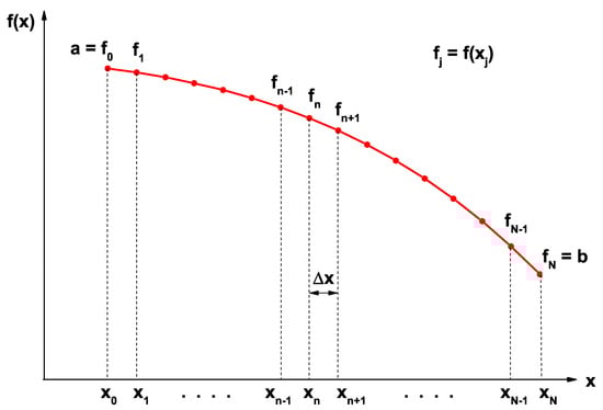 The FDM is widely used for solving differential equations. The advantage of implementing this method was to convert the differential equation into a set of algebraic equations that could be solved by any matrix or diagonalization method. Figure 3 represents a scheme in which the function (red curve) had been discretized in a set of points according to equidistant grid points on the x-axis, in such a form that was fulfilled by definition: for all in the interval .