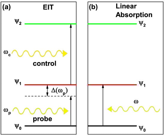 However, the EIT was an effect in which a material that presented a high absorption at a certain wavelength between two states ( and ) became transparent for that wavelength by taking advantage of the system interaction with two electromagnetic fields that had been coupled to three levels in the system. These fields were normally known as a probe field with a frequency of and a control field with a frequency of [33,34]. The probe field was associated with the coupling of the photons to the electronic transition. By considering only the probe field, it generated an absorption peak located near the energy transition. However, the control field referred to the coupling of the photons to the transition . Depending on the characteristics of the control field, a destructive interference effect could be generated to attenuate the peak of maximum absorption mentioned above, making the system transparent for the energy in which it presented its maximum absorption. Figure 4a shows the scheme of this system.