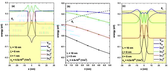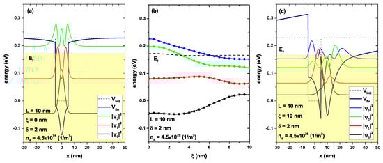 In Figure 6, it depicts the lowest energy levels for a confined electron in a GaAs/AlGaAs as a function of the on-center -parameter, Figure 6b. Figure 5a,c show the confinement potential and the probability density for nm and nm, respectively. Figure 6a shows the profile of the conduction band bottom for a quantum well of width L = 10 nm, not including the doped delta layer (black dashed curve). This profile corresponded to the electron confinement potential before starting the self-consistent process required to solve the system, including a donor density. The potential profile after self-consistency of the same quantum well, including a doped delta layer in the center (), is shown in navy color, width nm and (1/m). The shaded region represents the occupied states, and the curves in black, red, and green colors represent the probability density associated with the lowest three confined states, respectively. Figure 6c shows the same system but with nm; that is, the region in which the donor density had been distributed was increased. Therefore, for a region of 5 nm, it was not rational to discuss a delta-type doping; the whole region had been doped. The most evident effect was observed in the depth of the quantum well, which now presented the bottom at approximately eV, as the energy zero remained fixed at the bottom of the electron confinement potential; there was a clear decrease in the system energy, as compared to the system of nm. This modification in the bottom of the conduction band induced the appearance of new confined states, as shown in Figure 6c, the state (blue color curve). However, since the volume of the doped layer had been increased with a fixed donor density, this implied that the number of charge carriers must increase, and therefore, the Fermi level in the system must also increase. This was evidenced in the shaded region that now had a much higher value, even above the bottom of the band in the barrier region, causing a full occupation of all confined states. Figure 6b shows the energy spectrum corresponding to the confined states in the quantum well as a function of the width of the -parameter, with fixed nm, , and (1/m). The dashed line corresponds to the system’s Fermi level that presented a monotonically increasing behavior, as previously mentioned. All the states presented a redshift in energy, and the shift was more abrupt for lower states; for example, the ground state presented a shift of approximately 0.16 eV. This decrease in energies, despite having a clear increase in confinement with the increase in the -parameter, was because the energy had been measured according to the bottom of the electron confinement potential (dashed line in Figure 6a) and not for the lowest point of the conduction band that corresponded to the center of the doped layer.