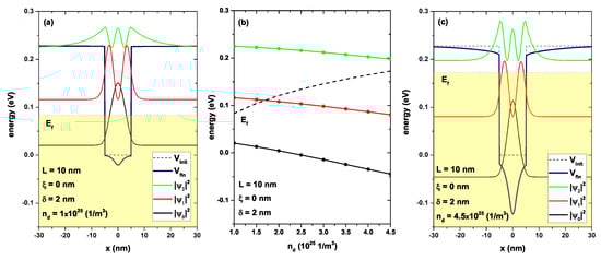 where is the width of the delta doped layer, is the Boltzmann constant, T is the system temperature (300 K in this work), is the Fermi level, and are the eigenvalues obtained by means of Equation (2). In Equation (3), the only unknown term was the Fermi level, . Clearly, this expression corresponded to a transcendental equation that could be solved for . Based on the above, it followed that the second step of the self-consistent procedure was to use the charge-neutrality relation to calculate the Fermi level.