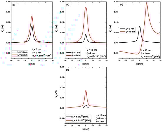 Self-consistent Hartree potential as a function of x-position. In (a) varying the L, in (b) varying the , in (c) varying the , and in (d) varying the . In each case, when one parameter was changed, the others were set to nm, , nm, and × 10 (1/m).