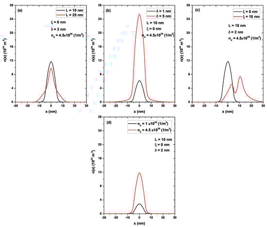 Electron density as a function of x-position. In (a) varying the L, in (b) varying the , in (c) varying the , and in (d) varying the . In each case, when one parameter was changed, the others were set to nm, , nm, and × 10 (1/m).