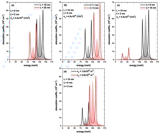 Figure 11 shows the absorption coefficient calculated according to Equation (16) between the states and (shaded curves. The absorption curves were multiplied by 5) as a function of the incident photon energy. The un-shaded curves corresponded to the calculation of the EIT between the first three states of the system calculated via Equation (22): in (a) varying the L, in (b) varying the , in (c) varying the , and in (d) varying the . In each case, when one parameter was changed, the others were set to nm, nm, and × 10 (1/m). In Figure 11a, we found that the absorption coefficient corresponding to the system with nm had a greater intensity than the one corresponding to nm; this was due to the matrix element corresponding to the system with the smallest L being higher. However, the photon absorption occurred at a higher energy of 125.6 meV for nm, as compared to the 97.3 meV of nm. This was expected since the states for a smaller L were further apart. As the L increased, more states entered the system, and the confined states began to converge, as shown in Figure 5. In Figure 11b, we observed that the peak of the absorption coefficient for nm occurred at 107.1 meV, while for nm, it occurred at 143.2 meV. This was due to increasing the width of the doped layer, as this increased the Hartree potential and, therefore, the depth of the quantum well, causing the entry of new states and a reduction in the separation of the already confined states. This behavior was evidenced in Figure 6. In Figure 11c, we observed that the maximum peak of the absorption coefficient corresponded to a system with , for an energy of 125.5 meV, as compared to the 42.7 meV of the delta layer located in the asymmetric system nm. The explanation for this behavior was evident from the analysis of Figure 7, in which the states and were closer when the delta layer was in the center of the quantum well. Whereas when the delta layer increased to nm, a double quantum-well system was generated, resulting in the appearance of new confined states and a decrease in the transition energy between the ground state and the first excited state (see the black and red curves of Figure 7b). Finally, in Figure 11d, the absorption peak was 95.6 meV for the system with × 10 (1/m) and of a significantly smaller magnitude than for × 10 (1/m), which had a value of 125.7 meV. This behavior could be understood through Figure 9c, which showed that the increase in the donor density caused an increase in the Hartree potential, and as a consequence, a deeper quantum well was generated (see Figure 8), causing a separation of the confined states and, particularly, an increase in the transition energy corresponding to . The maximum absorption energy was presented for the set of parameters nm, , nm, and × 10 (1/m), with an energy of 143.2 meV represented by the shaded red curve in Figure 11b.