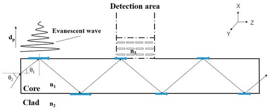 The intensity of the evanescent wave decreases exponentially with the increase in the distance from the interface, so the evanescent wave exists only on the reflected surface. The scattering caused by the mode mismatch between the OW and the detecting material leads to light attenuation. In the detection area, the refractive index of the material to be detected should be at least greater than the clad layer.