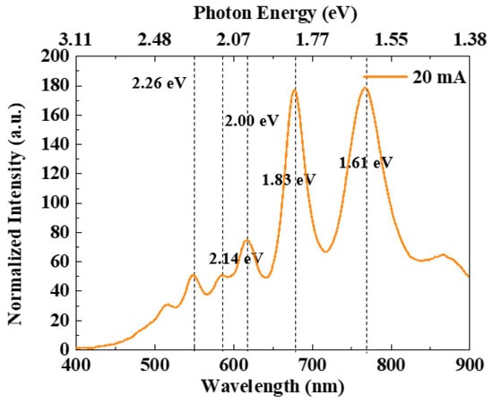 Figure 5 depicts the luminous lines. Figure 6 illustrates the electroluminescence spectra of the polycrystalline silicon cascade light source under a 20 V driving voltage and 20 mA driving current, which provided the conditions to simulate the OW propagation of this paper. In this condition, the light in the 400–900 nm wavelength range is stronger. Figure 6 highlights the presence of five peaks at wavelengths of 550 nm, 580 nm, 620 nm, 680 nm, and 770 nm. According to our analysis, the peak values at 2.26 eV and 2.14 eV may be due to direct band-to-band transitions between high-field carrier clusters. Defects introduced by carrier injection technology during the preparation phase could be the source of the 2 eV peak. The peak at 1.83 eV may be related to the indirect radiation recombination between the conduction band and the valence band, and the peak at 1.61 eV may be related to the transmission spectrum of the polysilicon layer [33].