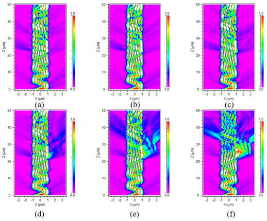 In order to verify the feasibility of the embedded OW model, this work simulated the change in the light energy at the end of the OW through varying refractive indexes of the materials, which ranged from 1.33 to 1.83. Figure 7a–f illustrates the energy distribution in the core of the embedded OW when the detected materials had refractive indexes, respectively, of 1.33, 1.43, 1.53, 1.63, 1.73, and 1.83. In the X-Z plane, on the side where the detecting material was located (i.e., on the right side of the core layer), energy loss increased with the increasing refractive index when the refractive index of the detected material was greater than that of the cladding. However, it is worth noting that there was a clear correlation between energy dissipation and refractive index variation on the left side of the waveguide core layer when the refractive index of the detected material ranged from 1.63 to 1.83. This may be because the refractive index variation in the detection region caused a slight change in the angle of light propagation in the core layer, leading to the escape of energy from the left side of the core layer, and thus having higher sensitivity. Typically, loss increases with an increasing refractive index.