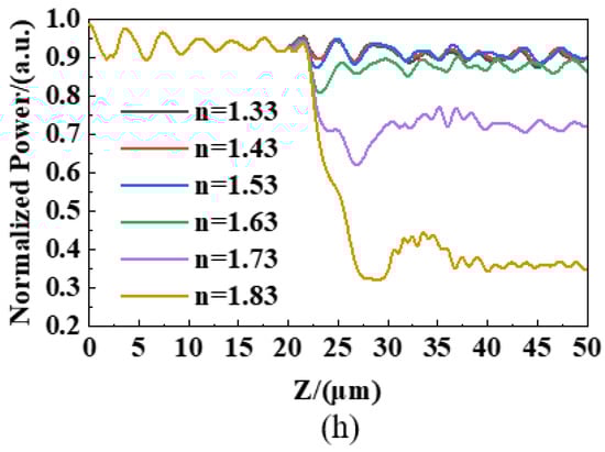 In Figure 8, the attenuation amplitude has almost no difference within the refractive index range of 1.33–1.53. For one thing, the refractive index of the detected material was smaller than that of the clad layer, so it was more difficult for light to spill out to the detected material. For another, it may be due to light scattering. The attenuation trend is obvious in the refractive index range of 1.63–1.83. Moreover, as the refractive index increased, the light energy loss was greater after a length of 20 μm, and the energy of the core layer decreased significantly. Furthermore, the core energy decreased faster as the refractive index increased.