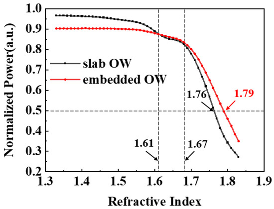 Compared to the conventional slab structure, the embedded OW structure designed in this paper had a lower detection loss. Specifically, we analyzed the energy distribution at the end of the waveguide for two types of structures with different refractive index materials and took the refractive index change gradient as 0.01. The normalized power of the two structures is depicted in Figure 9. The energy attenuation is obvious when it ranges between 1.61 and 1.67, and the light energy decreases from 87.5% to 84.5% in the embedded OW. This is because some light was transmitted into the detected material and dissipated. When the refractive index ranged from 1.68 to 1.83, the OW core energy decreased rapidly, and the light power decreased from 83.5% to 34.3%. When the refractive index exceeded 1.83, the energy loss was excessive, and it was difficult for the photodetector to identify the optical signal accurately. At the same time, the transmission loss of the embedded OW was smaller than that of the strip OW when the refractive index was greater than 1.61. For subsequent photodetectors, the lower the transmission loss in the OW, the more accurate the identification of optical signals. This work calculated that when the refractive index range was 1.61–1.67, the power decreased by 1.1%/0.01 RIU. When the refractive index range was 1.68–1.83, the energy decreased by 3.29%/0.01 RIU.