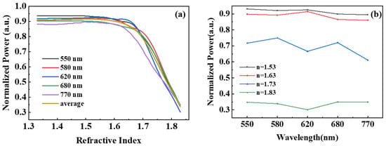 The dependence of the normalized output power of the OW on (a) the refractive index of detected material and (b) the wavelength of light.