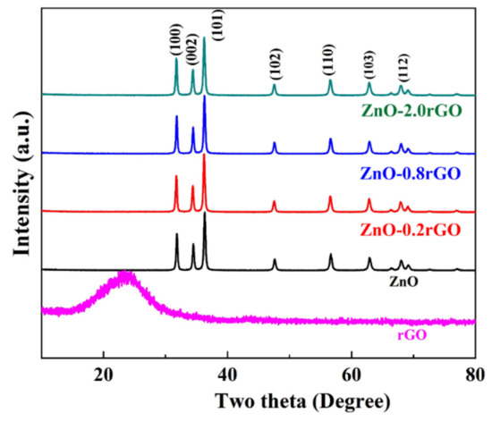 Figure 1 depicts the XRD patterns of rGO, ZnO, ZnO-0.2 rGO, ZnO-0.8 rGO, and ZnO-2.0 rGO. For rGO, there is only a broad diffraction peak (002) at 25°. The weak broad peak in rGO disappears in the ZnO/rGO due to the small content and high dispersion of rGO in ZnO/rGO. And the ZnO and ZnO-rGO nanocomposites with various rGO contents show high intensity of the diffraction peaks indicating a good crystallinity of the materials. The peaks at 31.9, 34.6, 36.5, 47.7 and 56.7° are assigned to (100), (002), (101), (102) and (110) planes of hexagonal wurtzite zinc oxide (JCPDS-36-145) [39,40]. No change in diffraction peaks of the ZnO-rGOs with that of ZnO indicates surface hybridization of rGO on ZnO because the lattice constant of ZnO remains unchanged.