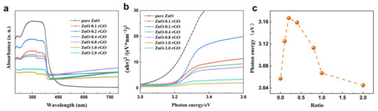 Figure 4a shows the UV-vis DRS spectrum of the ZnO-x rGO (x = 0, 0.1, 0.2, 0.4, 0.6, 0.8, 1.0, 2.0), which shows that the presence of rGO leads to an observable shift in the spectra [43]. As shown in Figure 3b, the optical band gap of ZnO-x rGO was estimated using Equation (1).