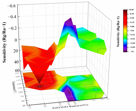 Overview: In the n-type region we find the maximum sensitivity, while in the p-type region we observe that the sensitivity decreases continuously as the doping ratio of rGO increases and maximum sensitivity appears in the p–n transition region. To observe the changes in sensitivity occurring for different ratios of ZnO-x rGO (x = 0.1, 0.2, 0.4, 0.6, 0.8, 1.0, 2.0, 3.0, 4.0), we plotted the sensitivity plot with respect to temperature and doping ratio. As shown in Figure 12, it is clear from the plot that the maximum sensitivity of the n-type sensing materials is ZnO-0.2 rGO at 125 °C, while the maximum sensitivity of the p-type sensing materials is ZnO-0.8 rGO at 75 °C. It shows that n-type sensing materials exhibit optimum sensitivity at high temperature (the red area), the best working temperature of p-type material is low temperature environment (the blue area). It (Line 4-2-5) indicates a change in sensitivity with increasing temperature, which is related to the change in internal carrier concentration. The change of temperature will affect the change of electron concentration inside the material and the adsorption and desorption equilibrium on the surface [46]. It (line 1-2-3) indicates a change in sensitivity with increasing ratio. It is the result of the joint action of p–n junction and rGO. ZnO-0.2 rGO has the maximum sensitivity at 125 °C in the n-type region because the p–n junction has the greatest effect at this time and the smallest concentration of electron carriers. It (lines 4-6-7) also shows that the sensitivity decreases with increasing rGO ratio. It (line 3-6) indicates a change in sensitivity with decreasing temperature. RGO plays a major role in the whole blue region, while it plays an auxiliary role in p–n. When the temperature is 75 °C, the hole carrier of ZnO-0.8 rGO is relatively small, and the role of p–n junction is greater than that of other conditions, so it has the maximum sensitivity.