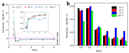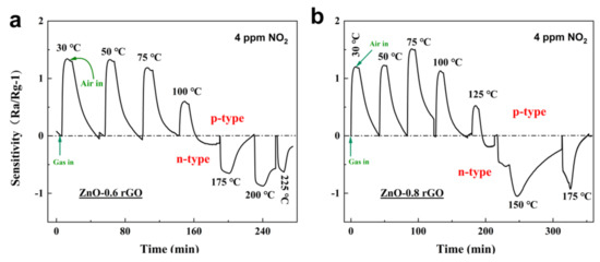 p-type sensing: As the amount of rGO continues to increase and reaches a threshold, rGO becomes the dominant factor and therefore the material transforms into a p-type sensing. When the doping ratio is increased to 0.6%, the composite starts to exhibit a p-type response in the low-temperature region (30–100 °C) at 4 ppm (Figure 10). As shown in the Figure 10a, the ZnO-0.4 rGO complex is n-type response, while ZnO-0.6 rGO exhibits a p-type response. As shown in Figure 10b, ZnO-0.8 rGO exhibit the maximum value of the p-type response in the p–n transition region. The sensitivity decreases with increasing rGO doping ratio in the p-type region. Compared with n-type complexes, the optimal operating temperature of p-type materials is reduced to 75 °C.