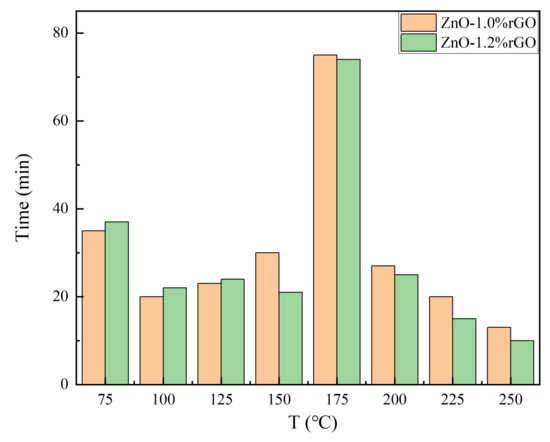 The ZnO-x rGO samples (x = 0, 0.1, 0.2, 0.4, 0.6, 0.8, 1.0, 1.2, 1.4, 1.6, 2.0, 3.0, 4.0) obtained by the hydrothermal method were used to prepare gas sensors. The sensing properties of the composites were tested at various temperatures at different NO2 concentrations. The sensor sensitivity was calculated according to Equation (2).