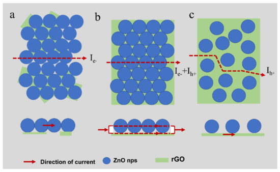 Scheme 2. Three conductive paths: (a) Conducting through ZnO; (b) Conducting through ZnO and rGO; (c) Conducting through rGO.