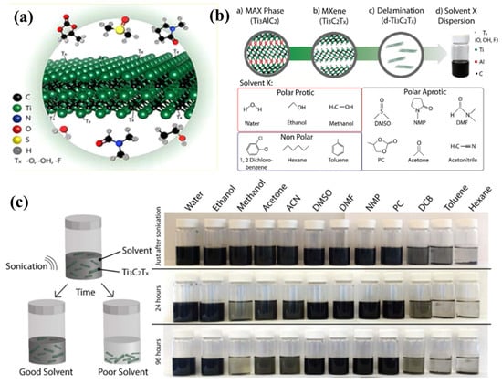 - Maleski, K.; Mochalin, V.N.; Gogotsi, Y. Dispersions of Two-Dimensional Titanium Carbide MXene in Organic Solvents. Chem. Mater. 2017, 29, 1632–1640. [Google Scholar] [CrossRef]