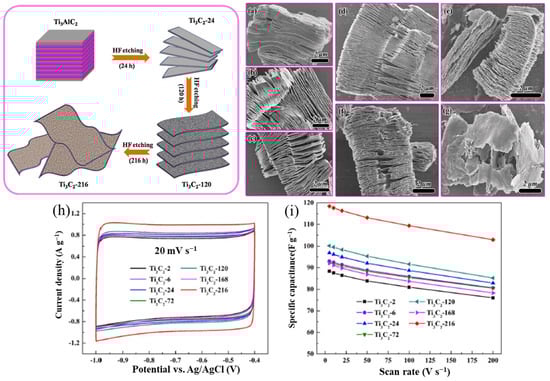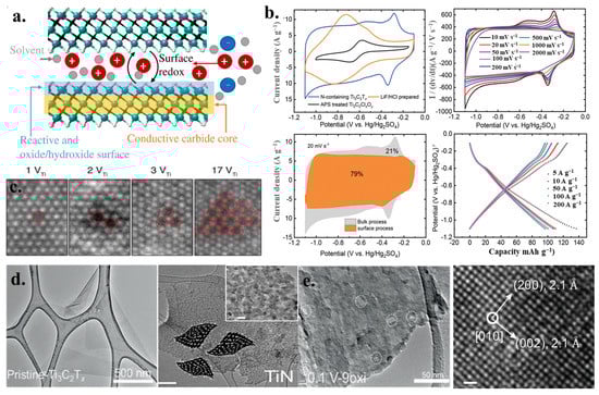 - Lukatskaya, M.R.; Mashtalir, O.; Ren, C.E.; Dall, Y.; Rozier, P.; Taberna, P.L.; Naguib, M.; Simon, P.; Barsoum, M.W.; Gogotsi, Y. Cation intercalation and high volumetric capacitance of two-dimensional titanium carbide. Science 2013, 341, 1502–1505. [Google Scholar] [CrossRef]