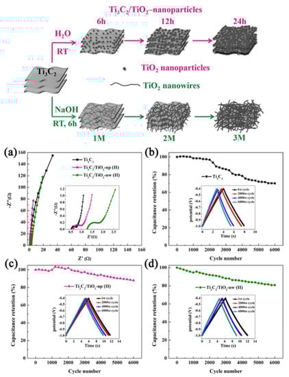 - Zhu, J.; Tang, Y.; Yang, C.; Wang, F.; Cao, M. Composites of TiO2 Nanoparticles Deposited on Ti3C2 MXene Nanosheets with Enhanced Electrochemical Performance. J. Electrochem. Soc. 2016, 163, A785–A791. [Google Scholar] [CrossRef]