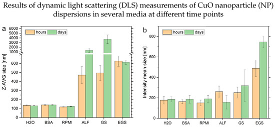 The observed size reflects only the hydrodynamic diameter of the particles inside the samples. Therefore, the observed size corresponds to the overall size of a particle, e.g., their metal/metal oxide and their so-called “corona” formed by matrix components. Furthermore, scattering particles influence the overall results with different contributions based on their size. This is, to a certain extent, reflected in the comparison of the sizes obtained by the z-average compared to the intensity mean-based hydrodynamic radii (see Figure 1). The polydispersity index (PDI) provides a general idea of the complexity of the size distribution of the sample. A PDI value below 0.05 represents a monodisperse sample, while a PDI above 0.7 reflects a broad size distribution of particle characteristics of a polydisperse sample. In combination with the count rate of the respective averaged measurements, these two parameters can be used to evaluate the measurement conditions in general and interpret the obtained results. Changes in the count rate provide a hint about the stability of the particles inside the solution, despite its automatic optimization. An average of the results based on the time points at 0, 1, 2, 4, 6, 8 h (see Figure 1, orange bars) and the results obtained after 1, 2 and 7 days (see Figure 1, green bars) highlights the different behavior of the same amount of CuO NPs inside the different media. The principle behind the size determination leads to challenges of measurements with ALF, GS and EGS matrices. The influence of newly formed or modified particulate content can be determined by significantly higher PDI values and more fluctuating count rates between individual repeats and time points. Another point, which has to be taken into account, is the less stabilizing effect of these matrices, which contributes to the higher standard deviations. These findings indicate changes in the particle content of the GS, ALF and EGS solutions. Due to insufficient particle numbers, the measurements of the blank media could not be used as a reference for background levels of particulate matter formed out of the media itself. In the case of GS, it was reported that the ionic content is not stable over time. This might lead to particle formation and agglomeration of the ionic content. In case of the EGS solution, the decreasing PDI and counts, in combination with the increasing size (intensity-based), can be attributed to the formation of lipid structures, such as liposomes, inside the solution or the formation of bigger NP-lipid clusters. A similar effect could be observed in experiments with gold NPs and liposomes [43]. These agglomerates may be formed over time and enhance the NP agglomeration too. Lastly, the results of the ALF solutions can be explained with a loss of particles derived from the significant decrease in counts between the time points. The pH-dependent dissolution of the CuO NPs in this acidic media points in this direction. This can be observed in the determined sizes based on the intensity mean distributions too. In comparison, the solutions containing water, BSA or RPMI cell culture medium provide similar responses for the size determination approaches with slight changes over time. The PDI shows slight differences between these media, as assumed from their composition. The count rates provide a stable measurement with smaller changes over time. A conclusion might be that the stabilizing effect of the bio-molecules and the buffer solution lead to better working conditions in terms of DLS measurements. With this summary of the results, the advantages of DLS are highlighted, which are to provide a first and fast insight into changes or their absence. A remaining challenge is correlating the observed parameters correctly to the underlying mechanisms. This is especially true for complex samples and matrices, as shown here.