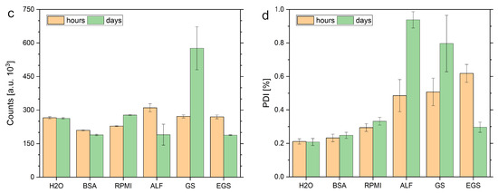 Summary of the mean Z-average size, intensity mean size, polydispersity index (PDI) and counts of the dynamic light scattering measurements of CuO NP dispersions (25 mg L, n = 3) in different media (Milli-Q water, BSA solution, cell culture medium (RPMI), artificial lysosomal fluid (ALF), Gamble’s solution (GS) and enhanced Gamble’s solution (EGS)) after about 0, 1, 2, 4, 6, 8 h (left bar, orange) and after 1, 2 and 7 days (right bar, green). (a) Provides the calculated hydrodynamic radius of the NP in solution based on the determined z average and (b) the mean intensity-based size in the different media. (c) Shows the particle counts of the measurements, and (d) presents the PDI of the particle size distributions after individual optimization of the measurement conditions of the different media.