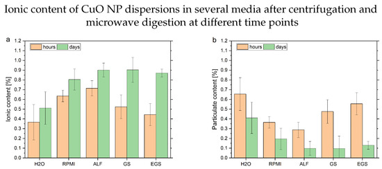 Measurements of the CuO NPs were performed with the Cu signal to avoid possible interferences from salts. Due to the complete dissolution of NPs as part of the microwave digestion, the ionic contents of the supernatant and the sedimented NPs were evaluated. These values were averaged to the total ionic content, and the particle-based part was calculated by taking into account the measured ionic concentration of the supernatant. In addition to the bar plots with long and short-term values, the ionic distributions at the individual time points were visualized to highlight the different influences of the media on the NP dissolution.