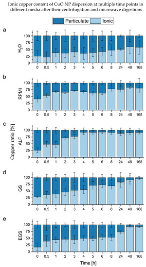 Summary of the measurements of CuO NPs dispersions (20 µg L, n = 3) in different media after centrifugation and microwave digestions as a percentage of the total ionic content. The different media are (a) deionized water, (b) RPMI, (c) ALF, (d) GS and (e) EGS.