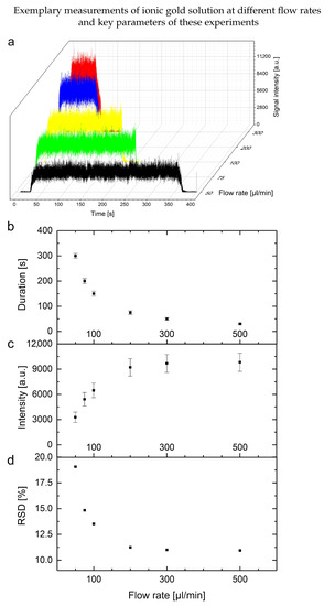 Summary of the observed influences of measurements of ionic gold solutions (5 ppb, n = 3) with different flow rates (50 (black), 75 (green), 100 (yellow), 300 (blue) and 500 µL/min (red)) on the average: (a) typical measurements (intensities per time) per colour-coded flow rate, (b) duration of the transient signal, (c) averaged intensities of the transient signal and (d) relative standard deviation of these measurements.